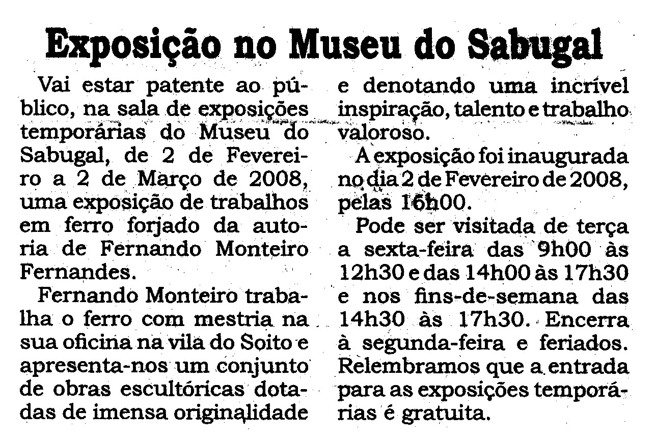 28 de fevereiro de 2008 A Guarda Página: 19 Título: Sabugal. Exposição de Trabalhos em Ferro Forjado |  | Clicar para ampliar |